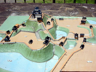 屋外に展示されています。屋外の自然条件下でも耐久性に優れているとされている有田製陶磁が用いられています。正保元年(1644)に幕府が諸大名に提出させた正保絵図をもとに、150分の1の縮尺で再現されています。 |