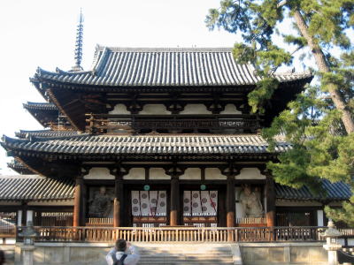 門の中央に柱を持ち、中央の二ヶ所の扉が開く仕組みになっています。左右には塑像の金剛力士像(奈良時代)があります。また、柱にはエンタシスがみられます。中門をくぐると正面に大講堂、左に五重塔そして右に金堂があります。西院伽藍の中心部です。周囲は回廊で囲まれています。通常は三間または五間なのに対し、正面が四間です。また、奥行きが三間と通常より一間長いのは、古い形式であることを物語っています。