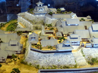 手前が二の丸になります。さらに奥には天守閣が見られます。往時の高知城はこのように多くの建物がひしめく姿をしていたと考えられています。現在も、本丸に残る建物はすべて当時のままで残されています。 |