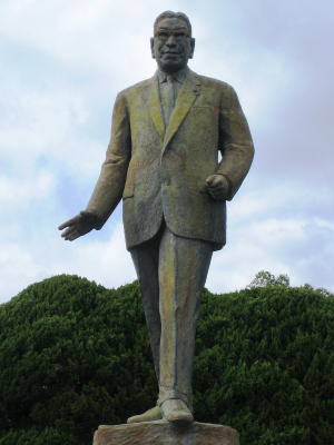 | 昭和35年(1960)に60年安保の混乱で倒れた岸信介の後を継いで内閣総理大臣に就任しました。 その直後に行われた衆議院議員総選挙では自由民主党のテレビCMに自ら出演し、「私はウソは申しません。」と言い、これが当時の流行語となりました。 在任中は所得倍増計画を打ち出し、高度経済成長を推し進めました。外交においては、訪米した際にJ・F・ケネディ大統領と会談もしています、さらに翌年の昭和37年(1962)にはヨーロッパ7カ国を歴訪し、シャルル・ド・ゴール仏大統領との首脳会談などを行っています。また、在任中には、東京オリンピックも行われています。 しかし、その閉会式の翌日、昭和39年(1964)10月25日に辞意を表明しました。そして、その翌年、咽頭癌による手術を受けましたが、その術後肺炎によって亡くなりました。 |