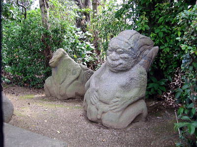 同じく、向かって左から「女」「山王権現」といわれています。一体誰が、何の目的で製作したのか、成立年代や作者などは一切不明です。石塔の四隅に置かれて、邪悪なものから塔を守る神だったという説、中国から伝わった仮面劇、伎楽に出てくる仮面を表したものとする説など、さまざまです。 (奈良県高市郡明日香村)