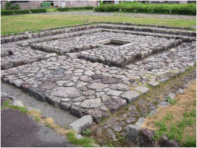 皇極天皇がつくったとされる飛鳥板蓋宮は、645年の蘇我入鹿暗殺(乙巳の変)の舞台となったところですが、その遺構の上の層、すなわち現在地表に表れているものは、天武天皇(天智天皇の弟。壬申の乱で勝利した大海人皇子)の時代の飛鳥浄御原宮であった可能性が高いそうです。この写真から堀立柱の遺構ということがわかりますが、当時はまだ、礎石を利用した建築法は知られておらず、そのため建物のおもに土台にあたる部分は、腐食が早かったといえます。(奈良県高市郡明日香村) 【伝飛鳥板蓋宮跡】