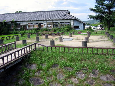 本丸跡は千畳敷とよばれ本丸御殿があったところと考えられています。発掘調査によると、碁盤目状に配列された119個の礎石が発見されました。これらの礎石の配置から、中庭をはさんで三つの建物が存在していたと考えられていますが、これは天皇の住まいである内裏清涼殿とよく似ていることが分かっています。織田信長に関する第一級の史料である『信長公記』によると、この建物の中には皇居の間があったといわれていることから、信長は安土城への天皇行幸を企図していたということでしょう。しかし、残念ながらそれは実現しませんでした。 (滋賀県近江八幡市)