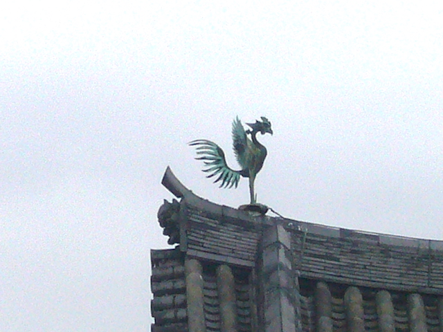 屋根には鳳凰がみられます。左側が南方像、右側が北方像と呼ばれています。近世以降阿弥陀堂は鳳凰堂とよばれるようになりましたが、それは概観が鳳凰が羽を広げたような形をしていることとともに、このような鳳凰の棟飾りがあることによるものです。(京都府宇治市)