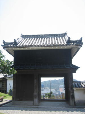 【高知城】入母屋造り本瓦葺きの櫓門です。柱や門扉に多くの鉄板が打ち付けてあるとともに、板張りで漆喰で塗られていないことから黒鉄門とよばれています。