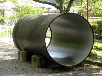 【琵琶湖疏水蹴上】この管はダクタイル鋳鉄管といって、水道管のほとんどに使用されているそうです。ここに置かれてあるのは直管といって直線区間に使用され、直径1.65m、長さ4m、重さは約5トンあります。第二疏水から取水された水は、この管を通って、約8キロ先の右京区、山ノ内浄水場まで導水されています。一日約26万4千立方メートルの原水を送ることができます。